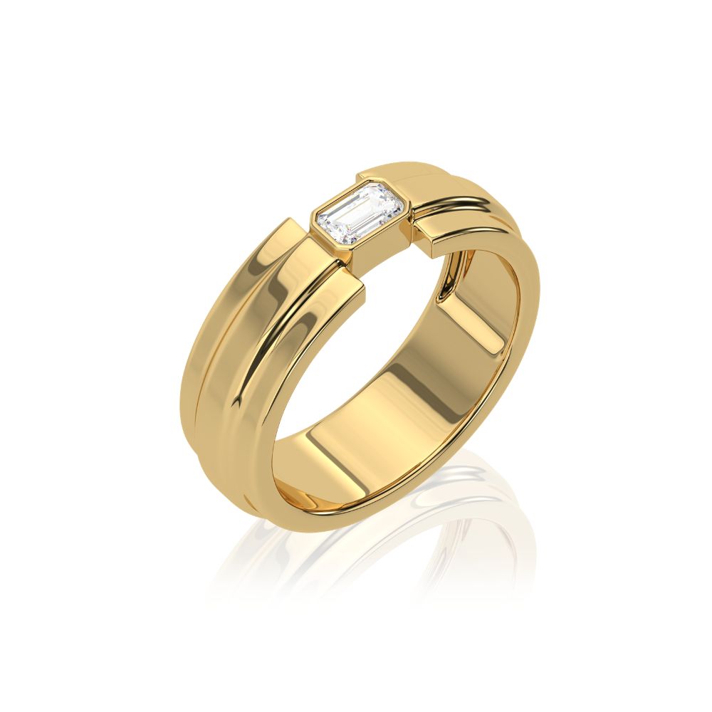 Crafted in 18K gold, this contemporary signet-style ring features a sleek emerald-cut diamond set at the center of a bold, structured band. The clean lines and high-polish finish enhance the geometric elegance of the design, while subtle groove detailing adds depth and character. Designed with a strong silhouette, this piece reflects modern sophistication with a refined, masculine edge.