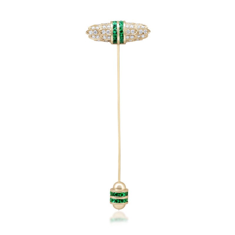 Elevate your formal attire with this exquisite Empire State Lapel Pin, a standout piece from our signature collection. Meticulously crafted with a gross weight of 5.32g, it features a sophisticated architectural design set in lustrous gold. The pin is brilliantly adorned with 0.524ct of shimmering diamonds and 1.04ct of vibrant green gemstones, offering a perfect blend of Art Deco elegance and modern luxury.