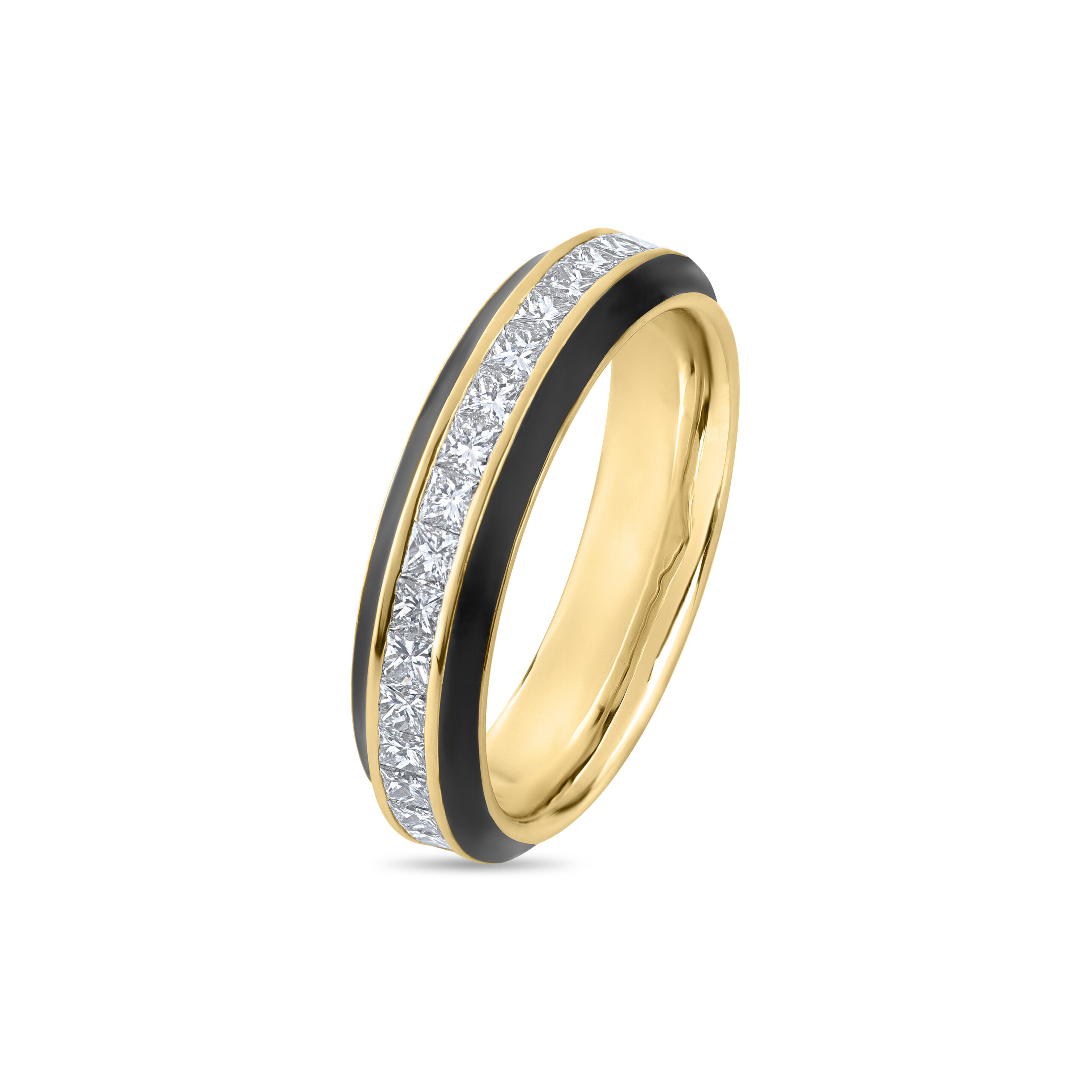 Crafted in 18K gold, this contemporary band features a sleek channel of princess-cut diamonds framed by a bold black enamel accent. The contrast between the brilliance of diamonds and the deep enamel finish creates a refined, modern aesthetic. With its clean lines and structured form, this ring offers a perfect balance of elegance and everyday wearability.